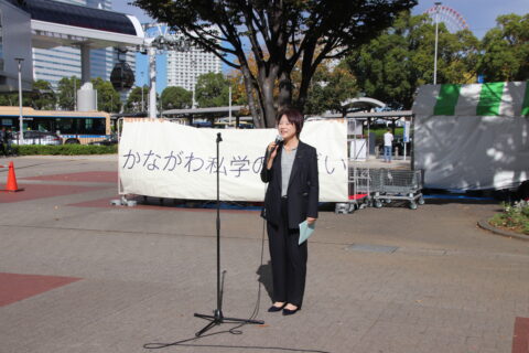 11月3日、桜木町駅前ひろばで「かながわ私学のつどい 2025」が開かれました。いろいろな私立学校の生徒さんや保護者のみなさん、神奈川私学教職員組合の先生方が毎年取り組んでおられる教育の無償化を求める活動の一環です。この場では私学助成の拡充を求める署名活動が取り組まれ、(この日は600を超える署名が集まったとのことです。)私学の生徒たちの部活動の成果が披露されます。