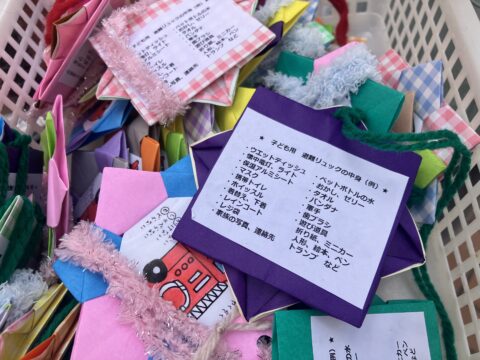 避難グッズは家族それぞれ用意すべし。小さな子でも自分のものは用意を。避難所で遊べるグッズを。手作りのペンダントは解体したらあやとりや折り紙にも。必要な物品をメモしてお買い物のときに一緒に確認しましょう。