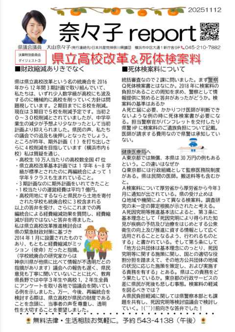 県立高校改革はご多分に漏れず全会派賛成で進められていますが、その中身は問題山積です。進め方の強引さ、教育環境の悪化。QAの形では書ききれなかったので変えました。死体検案料は前進しました。追求を続けます。