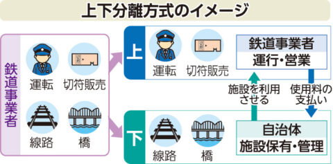 南阿蘇村や高森町の首長がなんとしてもと、県や国に働きかけた。熊本県副知事を会長に「南阿蘇鉄道再生協議会」を設立し国に上下分離方式※の導入を決定。新法人での運営体制に関し国に働きかけ新制度での国の支援が決定。鉄道事業再構築実施計画の認定を受けたことで国庫補助率が最大1/3→1/2へとかさ上げされました。着工後5年で全線開通が果たせました。簡単な上下分離のイメージは下のようです。