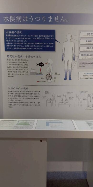 「魚(いお)湧く海」と言われた豊かな有明海。株式会社チッソは町の人々のあこがれの企業で町は窒素の城下町のような様相を呈していた。しかしその工場からの排水に含まれる水銀が人々の体を蝕み、奇病と言われる公害病が広がった。魚を日常的に食べていた市民が水俣病の発生により、漁ができなくなって生活困窮にも陥った。伝染病だと誤解され苛烈な差別があった。患者や家族が語るいくつもの動画、根本的な治療法がない中で一人の患者が半年間飲んだ薬の空き殻の量(人の胴体部ほどの量感でした)チッソの操業停止は死活問題と、チッソの家族からの工場操業継続の要望書や、水俣病という名前を変更すべしという運動の紹介。などなど多彩な展示内容でこの地を襲った公害病を多角的に把握できました。熊本県環境政策部水俣病保健課によるはじめて学ぶ水俣病
