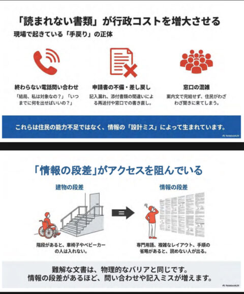 行政文書でわかりにくいものはないか、すべての人に届く文書をデザインする。ある文書のビフォーーアフターも見せていただきました。UDユニバーサルデザイン(年齢、性別、国籍、身体的能力(障害の有無)に関わらず、「最初から誰もが利用しやすい」ように製品、建物、サービス、環境を設計する考え方)は心掛けて、使用するフォントもUDにする程度のことはしているつもりでした。しかし今回学んだ伝わりやすさは議会報告などにも参考にすべき大切な視点でした。