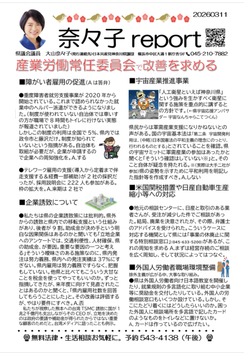 新着情報 NEW ブログコメント 0 「神奈川の電機産業と軍... 2026.3.22 NEW ブログコメント 0 県立中原支援学校の卒業... 2026.3.22 NEW ブログコメント 0 障がい者雇用&外国人労... 2026.3.22 NEW ブログコメント 0 現場の声で改善&予算の... 2026.3.17 すべて見る