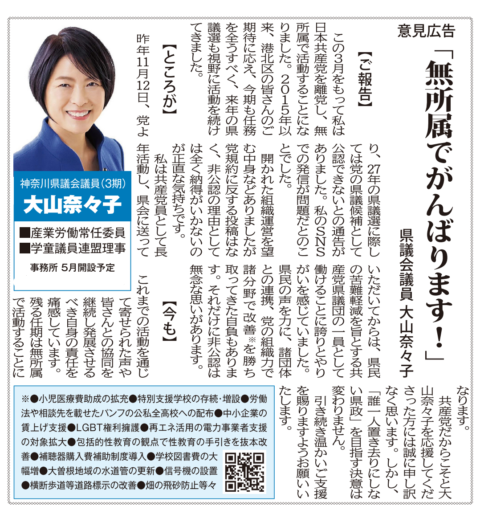 新会派は私の他にもいくつかあり、部屋の移動があることになります。政治団体や、資金管理団体を立ち上げたり、新しい事務所を探したり、新しい名刺やポスターのための写真を撮ってもらったり、議会休会中でよかったけれど、やることが山積です。幸い支援してくれる皆さんの力を借りながら進めていけるのでほっとしています。一人になっても県民の皆さんの声はしっかり聴いていきたいと思うので気軽にいらしてください。あ、今日は港北区のタウンニュース紙に私の記事が載りました。ご覧ください。